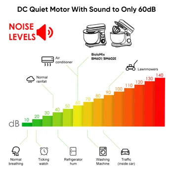 【Low Operating Noise ≤60 dB】 BioloMix kitchen mixer adopts high-quality DC motor and innovative construction, which contributes to low operating noise (maximum ≤60 dB), The splash guard with access hatch helps add ingredients without making a mess. Rubber suction feet for extra stability.