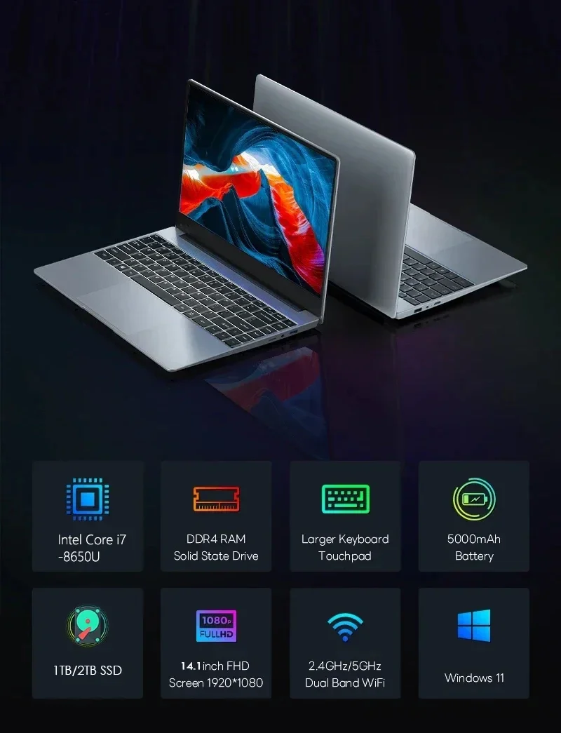 NEW 14.1″ Portable Laptop Windows 11 32GB 2TB Gaming Computer PC Intel Core i7 8650U Gamer office Notebook 1920*1080 HD