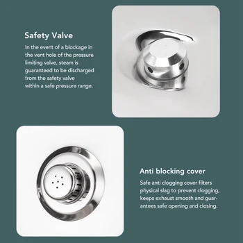 4.INTELLIGENT PROTECTION: The pressure cooker is equipped with a safety valve and a pressure limiting device, which can intelligently control the internal pressure and ensure the safety of the cooking process. This can effectively prevent explosions and other accidents, to protect the user’s safety.