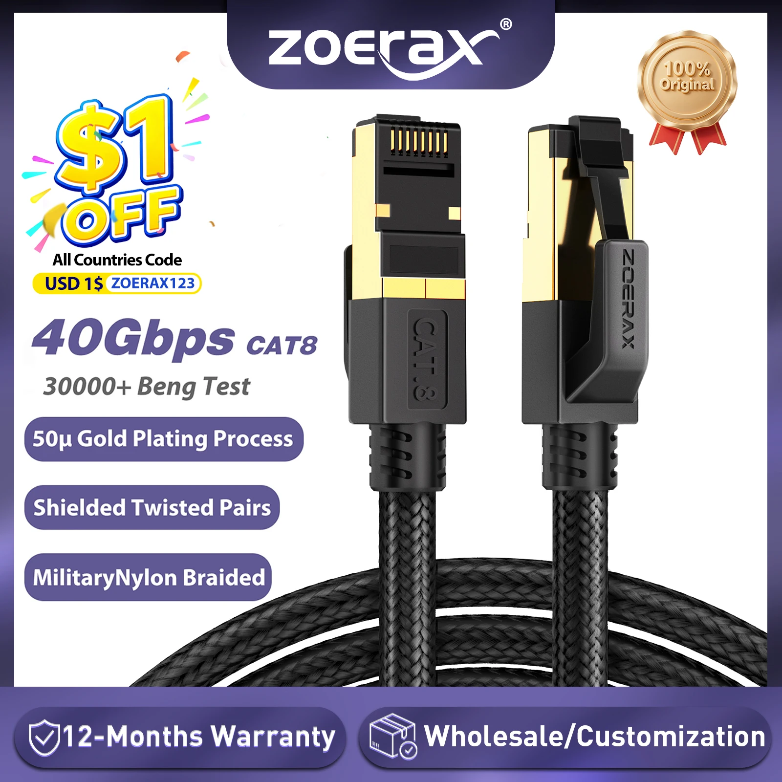 ZoeRax Cat8 Ethernet Cable 0.3-30M 40Gbps 2000MHz RJ45 CAT8 Network Nylon Braided Internet Lan Cord for Laptop PS 5/4 Router